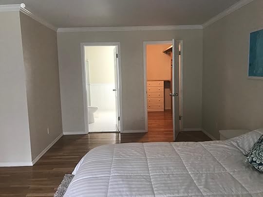 And a few shots from the bathroom looking out to the bedroom, before and after.