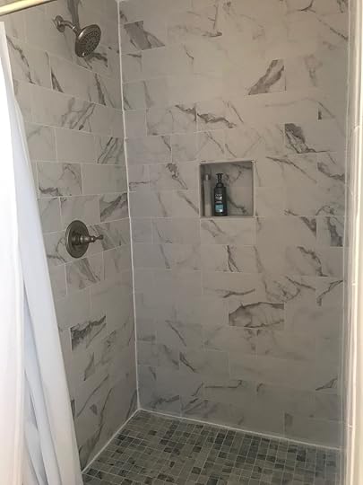 A bigger shower with new tile. Our old shower was OK but Mika is 6'4" and when he would wash his hair, his long arms would bump against the shower walls and door. I am not particularly tall but I have freakishly long arms (or maybe I just wash my hair weirdly) so my arms would always bump against the shower wall and door too. Not to mention, shower doors are a lot of work to keep clean. Now we have a nice, new, pretty 4' x 4' shower that gives us plenty of space and is easy to keep clean. The wall tiles are 6" x 12" and the floor tiles are 2" x 2".