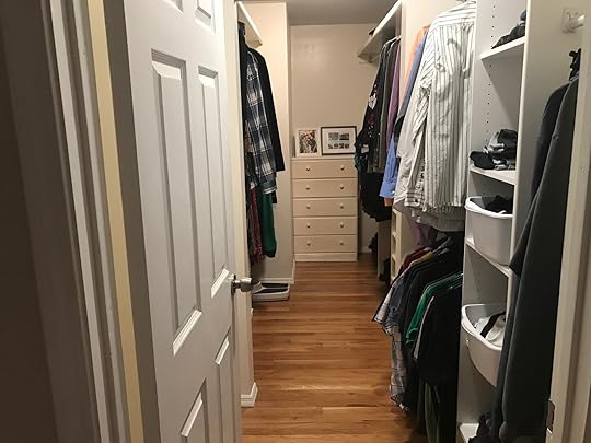 The existing master closet actually had plenty of space. But it had unfinished particle board shelves that looked super janky. We painted those white and then my dad extended the closet to the new wall in the master bedroom. We installed a few more shelves so that the new part served a purpose, which meant I could really spread out the stuff in the back part. I even have room for picture frames on some of the shelves!