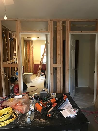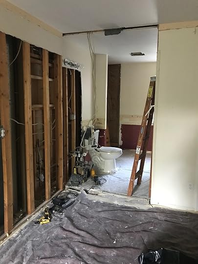 Plan A would have made the bathroom more square, letting more light in, and the closet would be an L-shape. But after Dad started demolition, we quickly realized that Plan A would require too much plumbing rework, including cutting into the ceiling from the dining room below. Remember how I said I didn't want to live in a construction zone? I also didn't want my retired-age dad working twice as long on a project he was doing for me for free. (I'm nice like that. Nice enough to let him redo my whole bathroom in exchange for home-cooked dinners and my pleasant company. I know who made out like a bandit on this arrangement!)