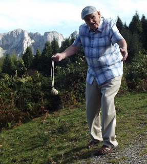 The plot calls for the hero Mikel to use an ancient weapon popular with the Sumerians and other soldiers in Babylon thousands of years ago. It was the sling shot, not a catapult but a simple sling with a pocket to hold a stone or a small rock. David used one on Goliath and the weapon is mentioned several times in the Old Testament. Well, I am a great believer that if one is going to write about an activity, you had better get the feel of flying stones from a sling shot. It took a lot of practice but finally I could hit a tree at 30 yards and that experience enabled me to write parts of the novel. Yes, while visiting the Urkiolas I actually practiced with the sling. My partner Betty Lou recorded the event by taking some photographs with the mountains in the background. Here's one.