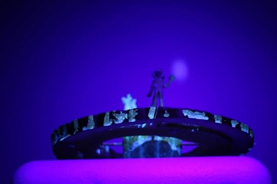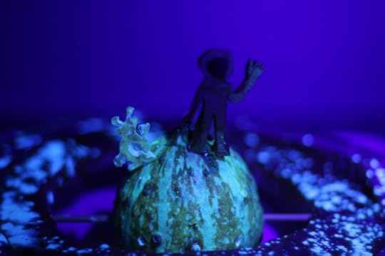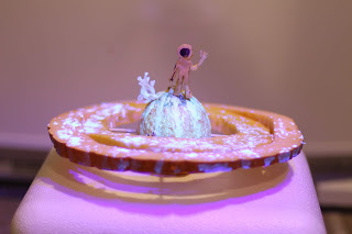 You'll notice the wealth of incredible details with this pumpkin, including the fact that the Saturnian glows in the dark but the astronaut doesn't, indicating that the magical phosphorescence of the planet lends itself to fauna as well as flora. In the second picture, you can also see that the rings are actually suspended around the planet, not resting on the ground—a true feat of engineering!