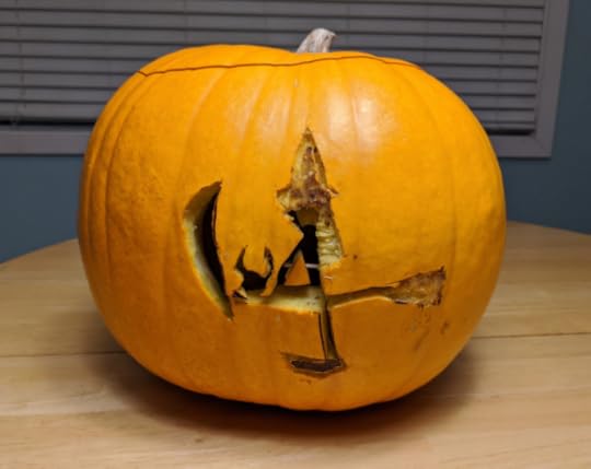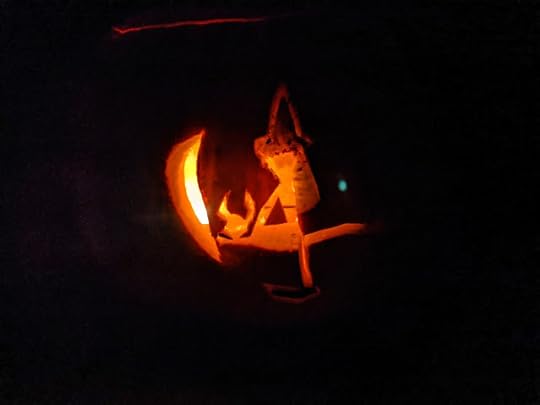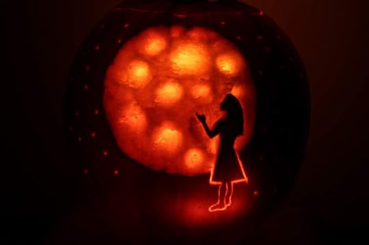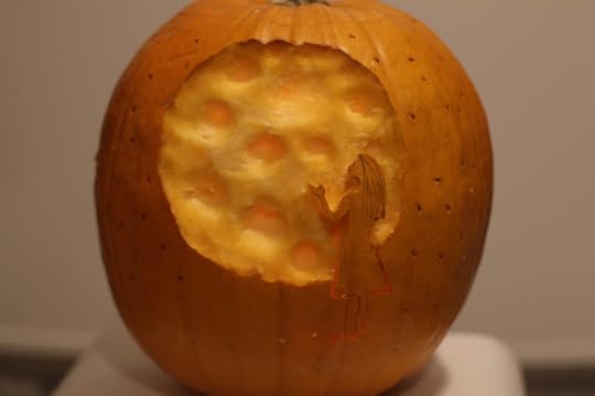 As always, all descriptions are written by me, and all photos are a joint effort between us both. This year Pumpkin A has more photos only because it is 3D enough to need to be seen from several angles to be appreciated; Pumpkin B, which is a more traditionally unilateral carving, shines (pun intended) through with fewer photos.