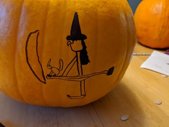 Postscript: This is actually the first year that Kate has expressed a wish to be in the contest. Alas, you can't actually vote for this pumpkin (I told her she has to get to the point where her pumpkin could pass for one of ours so she doesn't get votes purely by default!), but we wanted to share it anyway. The design is a witch riding a broom with her trusty feline friend in front of her, their flight path directly toward a crescent moon. Design by Kate, carving by Mahon under Kate's instruction.
