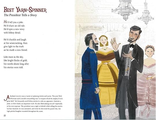 Consider my poem, “Best Yarn-Spinner: The President Tells a Story.” Our sixteenth president was a legendary story-teller and he used that gift to his advantage. He told stories to connect with others, help folks consider a different point of view, deflect from giving a straight answer, and more. Lincoln was a master at interpersonal communication and relationship building. What would Lincoln think about texting someone about a key matter instead of talking face-to-face? I believe there is much that we can learn from how our sixteenth president handled situations. Sharing these stories with young readers is an opportunity to start a conversation. Many of these poems provide great topics for discussion. Abraham Lincoln’s actions and life inspire me, and I hope that is the case for others, too.As for my process, it is pretty simple: I read a lot of history about my topic; I do a lot of thinking about what I might want to share in a particular poem; then I write a really awful first draft of a poem and constantly revise until it sparkles. That’s it. I take my time and work slowly when I am researching and writing.Creativity – How do you showcase your creative side through writing/illustrating and other pursuits?I love the creativity that is inherent in being a children’s book author. I select the topics that I want to write about, I choose how to engage the reader (through poems or narrative text), and I also carefully consider which information to include in the book. What is important and essential to that piece of work? I pick topics that interest and intrigue me. I know that I’m going to spend a lot of time researching, writing, revising and later on, telling potential readers about the book, so working on a subject that I’m passionate about is a huge win. I’m excited to get up and begin my work each day! I find new topics through reading, exploring historical sites and museums, chatting with others, and more. It’s fun to let the wheels spin within my mind and consider, “What is important about this subject? Would a young reader want to learn more about this?”