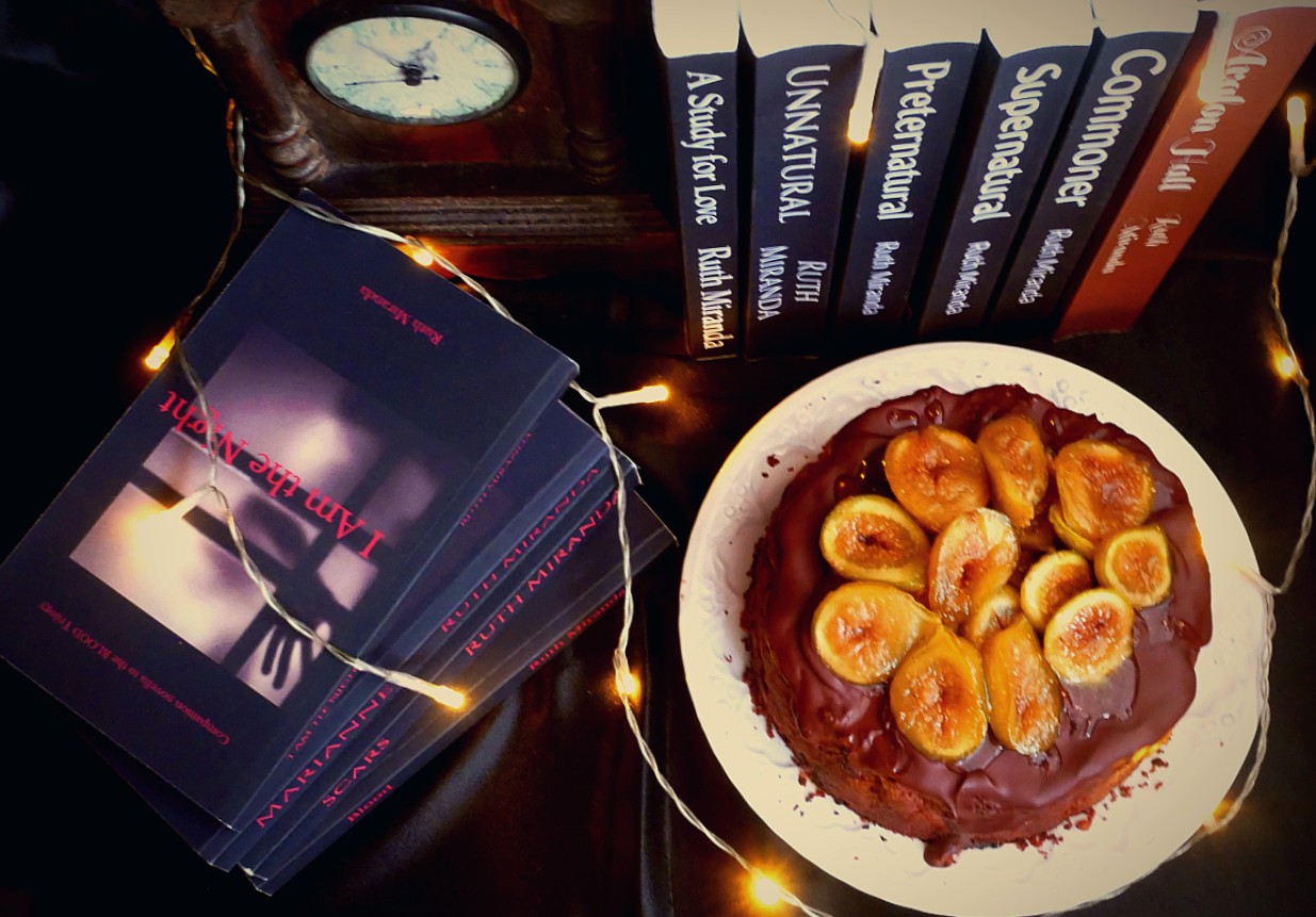 So this past October, when I celebrated my birthday, I celebrated all these milestones too. I celebrated the ten years it took me to get to this place, ten years down the line and ten books published. I celebrated myself and my decision to give up, when in fact I wasn't really giving up, I was giving in to the only thing I can do. It may not pay the bills, but I hope in ten years' time it'll at least help cover some of the expenses. Until then, I have cake and books and it's not bad at all. So here's the cake for you:150 gr flour150 gr sugar150 gr butter2 tsps baking powder3 medium to large eggs100 gr dark chocolate + 100 gr dark chocolate1/2 cup cream1 cup walnuts1 tsp buttercaramelized honey figs (just heat up honey in a saucepan, let it darken slightly, add the figs, let cook for five minutes.)Fig jamTurn on the oven at 180º Cream the sugar and butter until fluffy and white. Melt 100 gr of dark chocolate and add to the sugar and butter, mixing well. Start adding the eggs one by one, along the flour and baking powder. Make sure the batter is silky and everything is combined. Fold in the walnuts, pour into a baking tin - I used a small round one because it's a small cake, really - and bake for at least 35 minutes, but check at the 20 minute mark. When the cake is done, allow it to cool completely before you decorate it. I cut the cake horizontally in two and layered some fig jam over the bottom half, then covered with the top one. Then I melted the rest of the chocolate with the butter and the cream and poured it over the cake. Finally, I added the caramelised honey figs and served. It's an easy but delicious cake, one you can indulge in once in a while, especially if you want to celebrate yourself!
