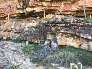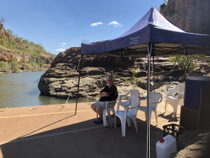 Tues 23/4/2019. We finally make it to the Katheryn Gorge Cruise. Paul wheeled Alan down the long ramp and onto the first boat. We look up at high red cliffs on either side of the first gorge. There are thirteen individual gorges, all connected during the rain fed wet season and separated in the dry, but only two are ever open for public viewing. Today’s trip comprises of those two gorges with a walk from our boat to another in the second gorge. Alan and I decided to wait in the shade for our group to arrive back from their second gorge tour. Our leaders had put chairs under a strategically placed shelter on the natural rock landing . Iced water is nearby in case we get thirsty. It is easy to dehydrate here. We found it such a delight to quietly sit listening to the water and feeling the cool breeze fan our faces.