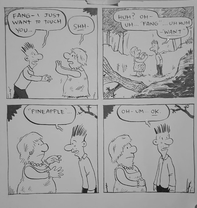 The roughs for this had 4 identical panels (identical to panel 3 here) and the text was "fang", "want" and then 3 and 4 like you see here.
