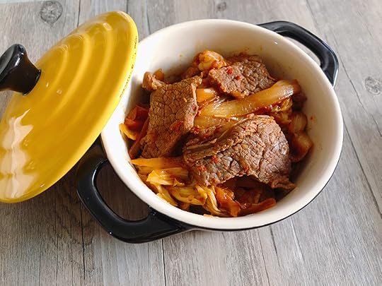 家裡還有剩下的泡菜,就加入洋蔥跟牛肉,做成韓式醬燒牛肉。