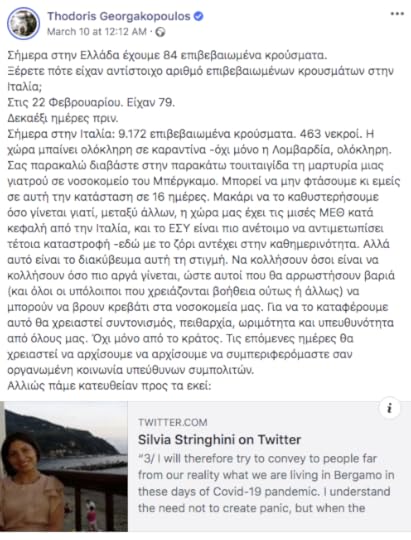 Έχουν περάσει 16 ημέρες από το παρακάτω post. Τότε ήμασταν, λέει, 16 ημέρες πίσω από την Ιταλία. Τότε η Ιταλία είχε 463 νεκρούς από τον κορωνοϊό. Τα μέτρα που εφαρμόζουμε εμείς φαίνεται ότι έχουν αποτέλεσμα, γιατί 16 ημέρες μετά -και μολονότι το σύστημα υγείας μας είναι σε πολύ χειρότερη κατάσταση- εμείς έχουμε 20 φορές λιγότερους νεκρούς από ό,τι είχαν εκεί τότε. Δεν είμαστε πια μόνο 16 ημέρες πίσω. Έχουμε κερδίσει πολύτιμο χρόνο.