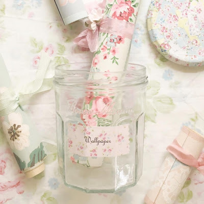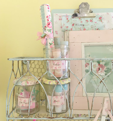 I use jars in the Girlie Office to display small supplies. For this project, upload a floral fabric image and size to fit a mailing label, add text on top in an unfilled box, and print to create pretty labels**; trim sides with a scallop-edged scissors if you have one handy. Use label scraps to cover the lid.