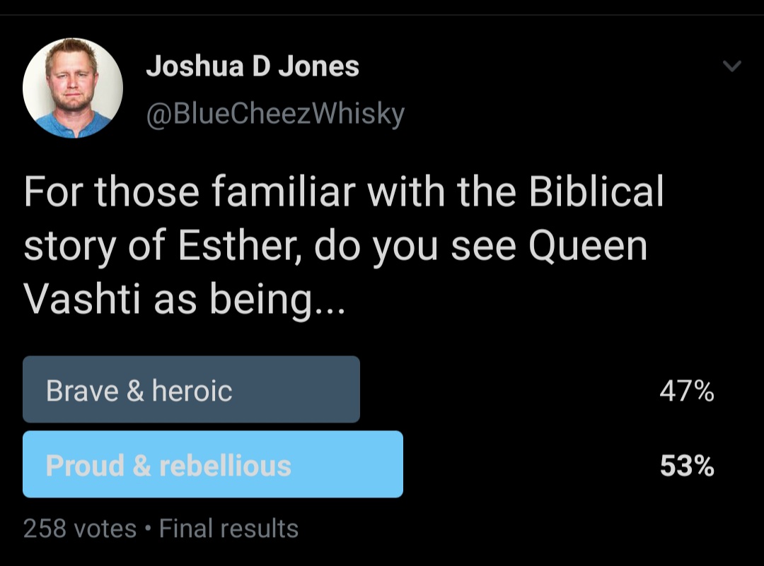 Two SidesNo matter how thinly you slice your bread, there is always going to be two sides. In the same way, the account of Xerxes’ divorce with Vashti currently has two views. If we are going to be careful readers of the Bible, we need to exercise our minds to determine which understanding of the events is most likely. This is not easy as the details on Vashti are sparse and there is debate among some scholars as to whether she existed or is just a fictitious plot device to set up the story.Now, most Bible teachers agree that Xerxes’ request probably wasn’t well thought out or timed given his having drunk too much. But some teachers go beyond this and argue that Vashti was a brave martyr for the cause of women everywhere because of her refusal to obey the king’s request. They believe that Xerxes was really calling Vashti out to the party only to humiliate or objectify her in a way that was contrary to her otherwise upright character. Some even see Xerxes’ request to come out wearing the crown to mean wearing only the crown (meaning to come out naked). Her refusal is therefore seen as something noble and exemplary. Mike Cosper expresses this view in his book, Faith Among the Faithless. He writes, ‘She heard the throb of the music, the roar of the mob. And tonight, Vashti would say no. For her dignity. For the dignity of her handmaidens. For the women of Persia, Vashti would say no.’Others, of which I am one, agree that Xerxes was a terrible husband, but also think that the Biblical authors want us to see Vashti as being just as proud and unexemplary as Xerxes. Why do we think so?