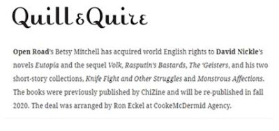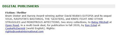 Here's the official announcement that went up today (May 1, 2020) at PubLunch courtesy my agent Ron Eckel at Cooke-McDermid.
