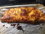 Son and I couldn’t agree on how to dress them when they came out of the oven. I wanted a cheffy approach with a smear of coulis on the plate, and some chocolate shavings, but he preferred the coulis to be spread across the top of the calzone. I thought it looked like roadkill, but since he’d done the bulk of the work assembling them, it was fair for him to decide.