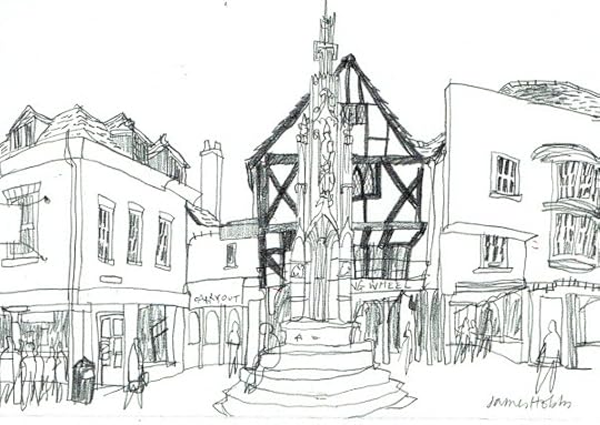 James Hobbs, Butter Cross, Winchester, 1990A walk down by the water meadows is a popular thing to do on a Sunday afternoon. Homesick little boys in suits are taking awkward strolls with parents past the cricket pitches, and happier-looking, scruffier boys peer into the river from bridges look for trout. The meadows are remarkably unspoiled despite being so near to the city centre. A dual-carriageway snakes around the foot of St Catherine's Hill, the footpath to its summit passing beneath it. It's a steep climb that leaves me puffing. At its top there is a maze, the old Iron Age fort, and a wonderful view over the city.