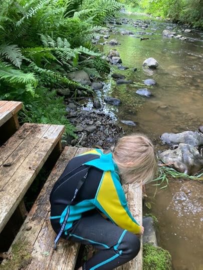 Hanging with my granddaughter at my girl’s little farm. This is great fun. Her mom and dad have salted the creek with fancy rocks. We found them over and over again. On rare 90 degree days on the coast, the creek feels wonderful.