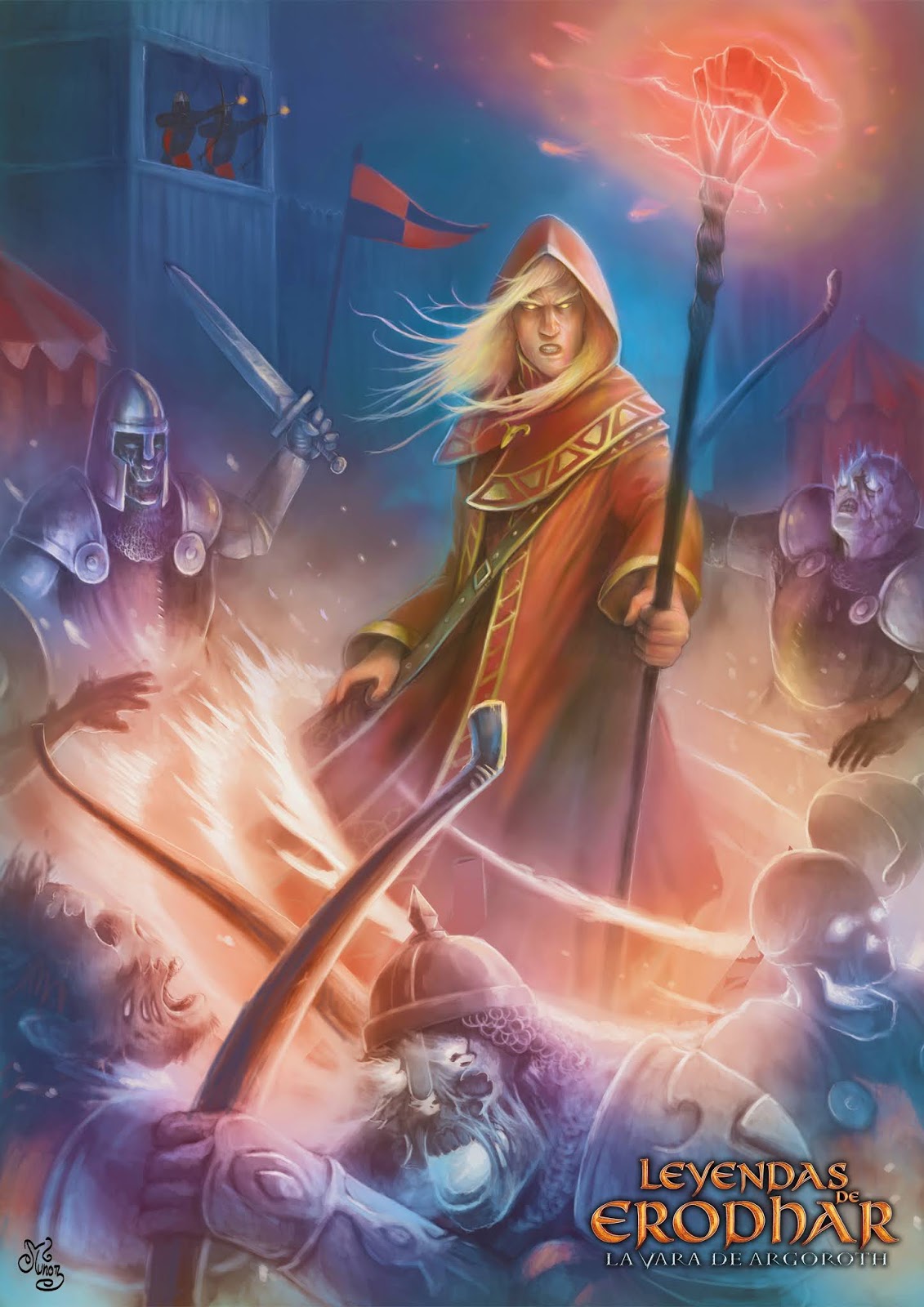 Ilustración del aprendiz de mago Laurelinad, personaje de la saga Leyendas de Erodhar, en una de las escenas más importantes del primer libro. El dibujo es obra de Ricardo Muñoz.Los vientos de guerra asolan Erodhar y amenazan con aniquilar a todo ser vivo. Valiant y sus amigos deben encontrar la forma de evitarlo. Para ello, vivirán multitud de aventuras y se enfrentarán a monstruos y tiranos. El destino de hombres, elfos, orcos y enanos pende de un hilo. No esperes más, ¡vive la leyenda!