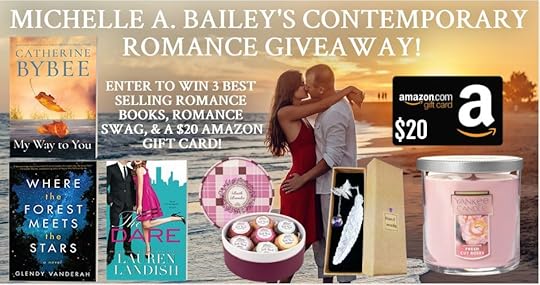Enter to win this prize pack that includes paperbacks of The Dare, Where the Forest Meets the Stars, & My Way To You, along with a rose scented candle, 7 piece bath bomb set, handmade bookmark, & $20 Amazon Gift Card!