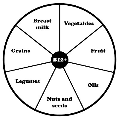 Vegan complementary feeding: the food groups (B12+: Vitamin B12 supplement, plus further supplements if required; figure adapted from “Supplemental Figure 2. The VegPlate for infants (6 to 12 months)” by Baroni et al. 2019)P.S.: Apologies to Brenda Davis, should I misquote her by saying "Let's do this right" (in the Amazon book blurb). She might rather more commonly say "Let's do this properly."