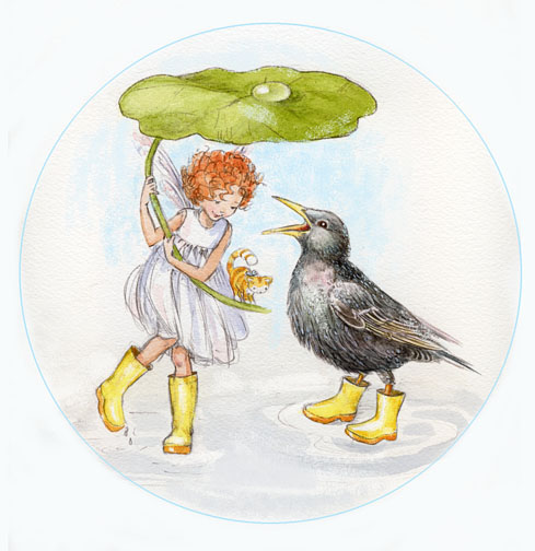 Anthea and Marigold celebrate by singing a spring rain song with their friend Starling. The European Starling still wears his beautiful spotted winter coat.