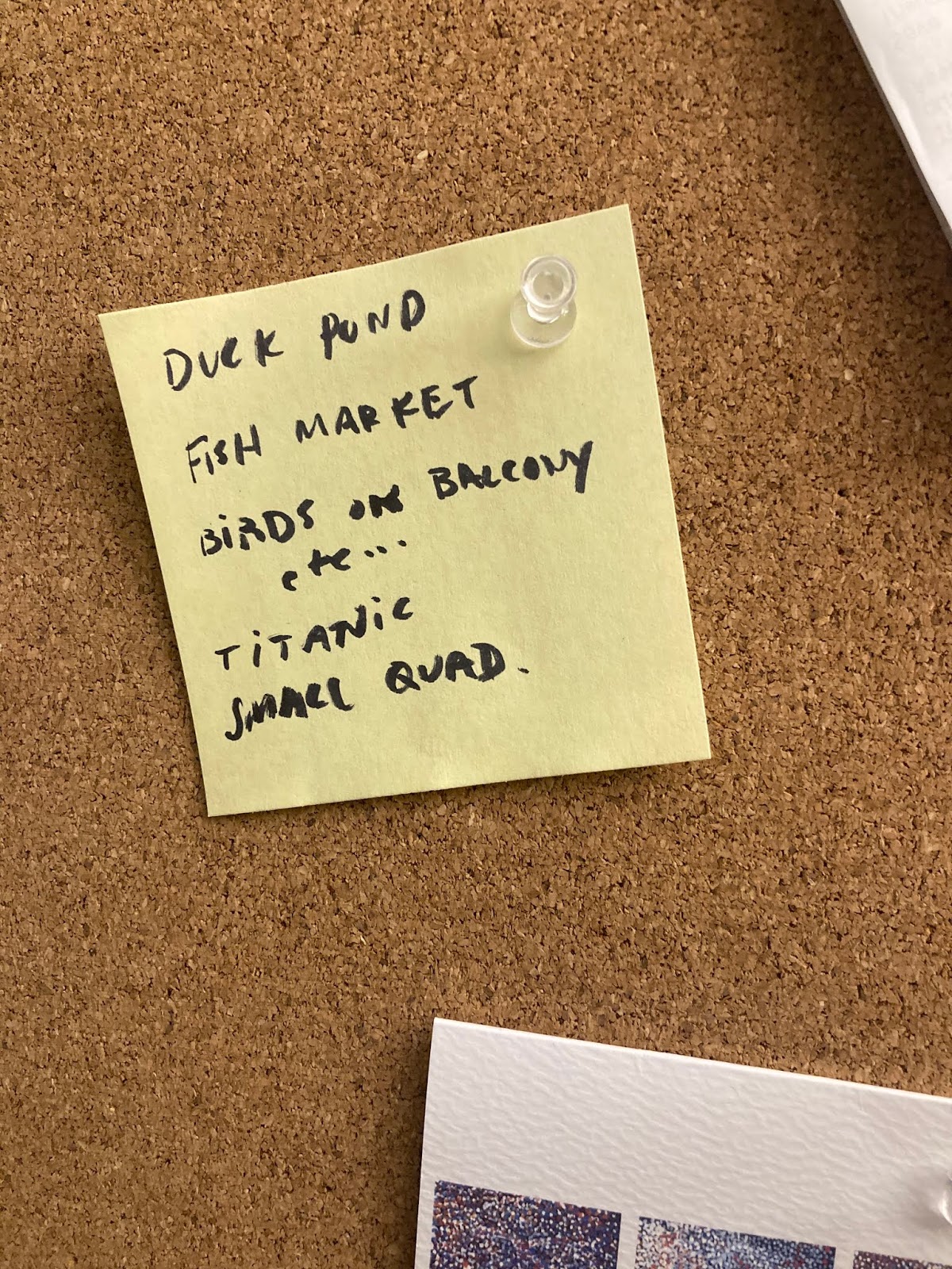 The project organizer signed off on the umbrella concept. Now I wouldn't have to come up with six separate premises--but I still needed six distinct ideas. My husband and I sat out on the balcony over the weekend, brainstorming what we thought of when we thought of the SW quadrant, and why we'd moved here five years ago. The next morning, he presented me with a Post-It on which he'd jotted notes.