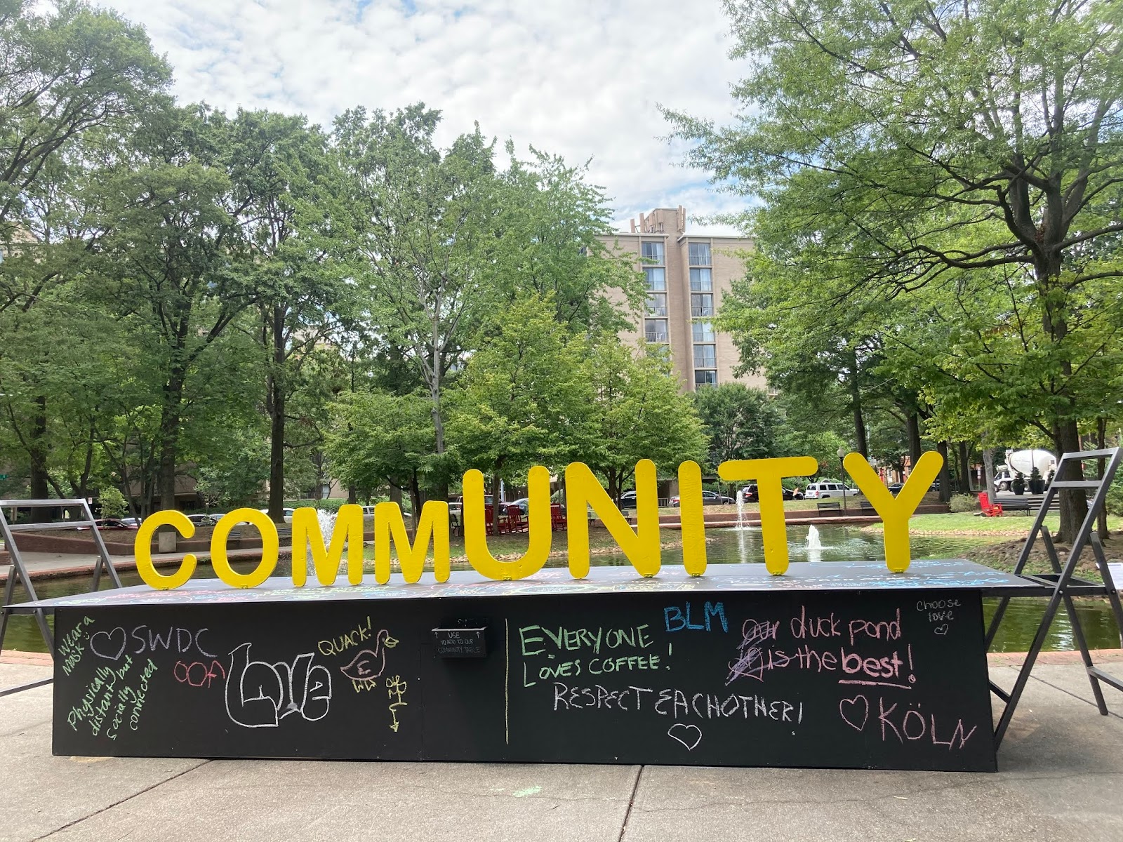 As I write this, a tropical storm is passing through the city. So I have to hope that those laminated pages are water-tight, and that the letters in "community" are fastened to stand against high winds. I have to keep faith that the sun will come back, and people will gather to the duck pond to sit in the rocking chairs and read poems. Nothing's easy in 2020. But I'm still here, and you're still here, and that's a start to something.