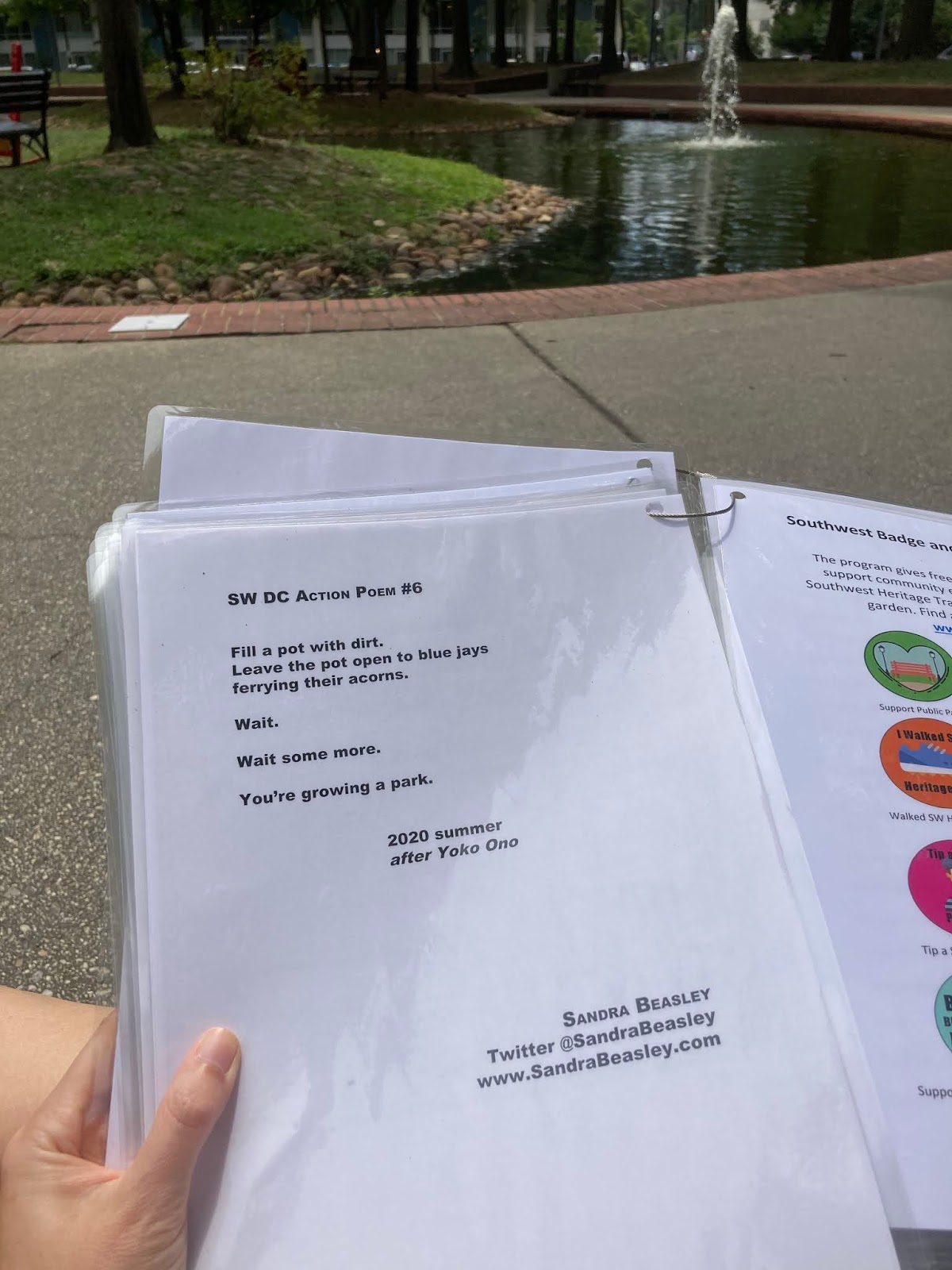 But I really wanted to take part in this project, to be staged in the Southwest Duck Pond adjacent to our apartment in DC. That's the park I look out over, from our balcony; the park whose quacking ducks keep company on quiet summer days; the park we walk through on our loop to the farmer's market. For me, the Southwest Duck Pond is the heart of the neighborhood, and I couldn't imagine passing on the chance to have poems there.