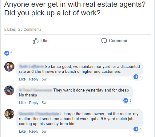 If you don’t want to spend the time organizing an entire prospect list in approach #1, you can try prospecting them through their Facebook page or join local real estate groups. Let’s say you have a lawn care business in Jacksonville Florida, here’s how you would execute a Facebook outreach;