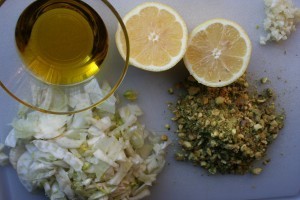 Last year I pickled fennel and it was delicious—I used it a variety of ways. One was as a salad on top of mortadella salami, garnished with pistachio nuts. I was thinking about that garnish and figured it would be tasty to have on hand a finocchio and pistachio compote in oil to hold in the fridge.