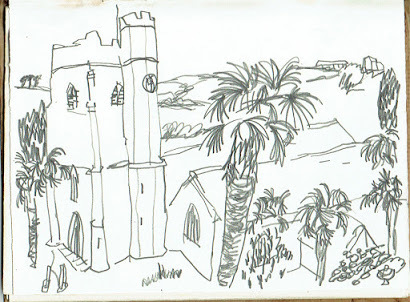 The care and attention that has been given to this church is a mirror image to to that I had seen bestowed upon St Anthony's yesterday. Heading through the tropical vegetation (a memorial to the eccentricities of successive clergymen who have devoted themselves to it), weaving between palm trees and ponds, I can imagine us for a moment as a group of expatriates making our way through some outpost of the Empire. Someone shouts, “But Dorothy, how frightful!” without a trace of a Cornish burr. Watching the little crocodile of elderly congregation disappearing towards the tower set against a creek, I half expected them to be gradually picked off by sniper fire from the rear.