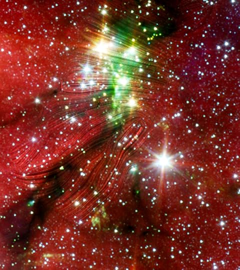 More about the novel in a while… first, the recent science research. This came about when a team of astronomers combined visual images from the (now retired) Spitzer Space Telescope with infra-red images from the SOFIA, the airborne Stratospheric Observatory for Infrared Astronomy. Both devices were pointed at the Serpens South star cluster, a region about 1400 light years from Earth, where stars are being formed.