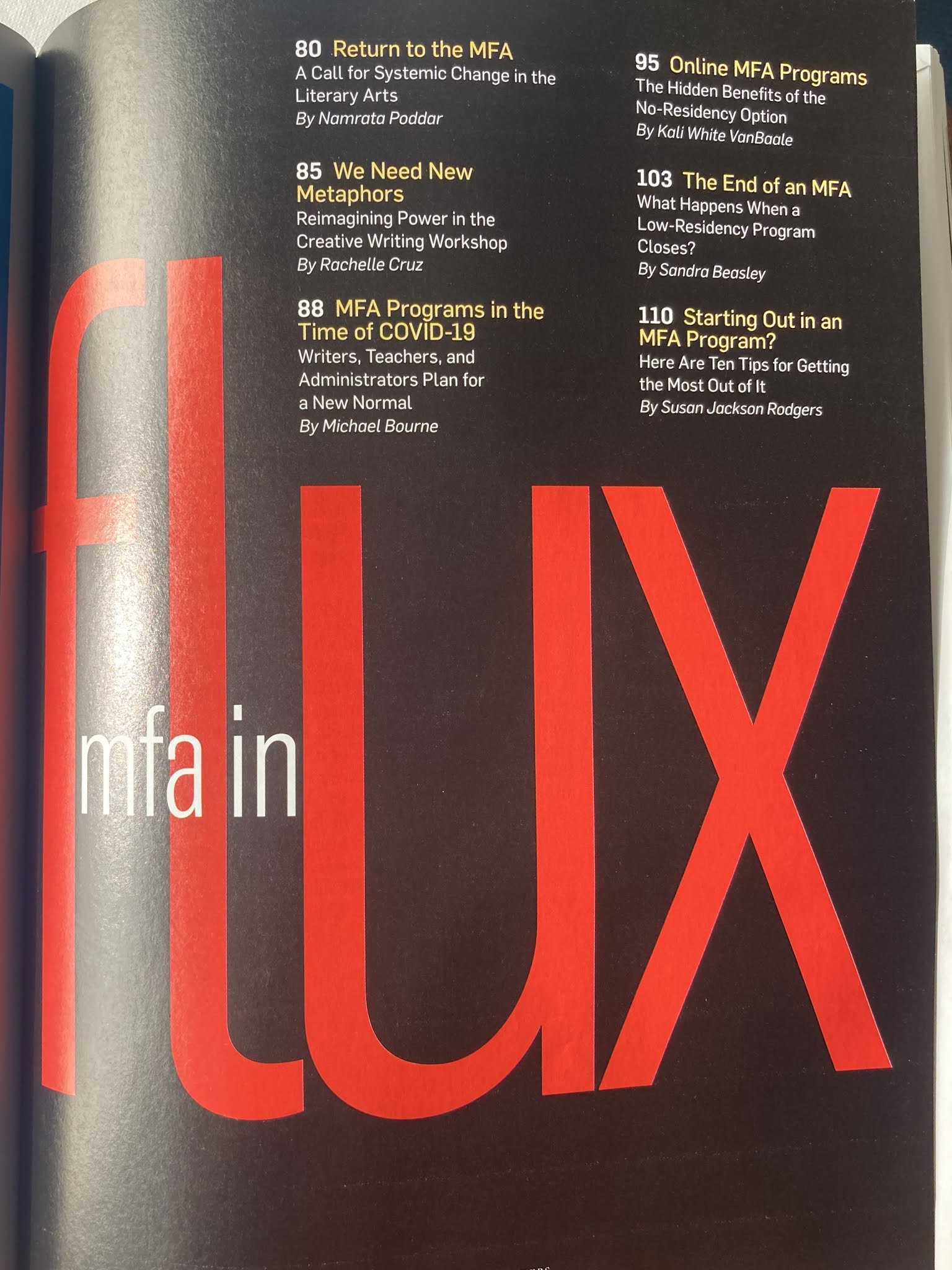 I have a new piece out in a nationally distributed magazine, and usually when that happens I shout from the rooftops. But I've been quiet this time--until a couple of friends, earlier this week, gently asked: why the silence? Part of the reason is that my essay, "The End of an MFA: What Happens When a Low-Residency Program Closes?" is not online; there's no link to share. Anyone interested will have to go pick up the September/October issue of Poets & Writers off the newsstands or, more likely, get around to finally reading the subscriber's copy that arrived a few weeks ago.