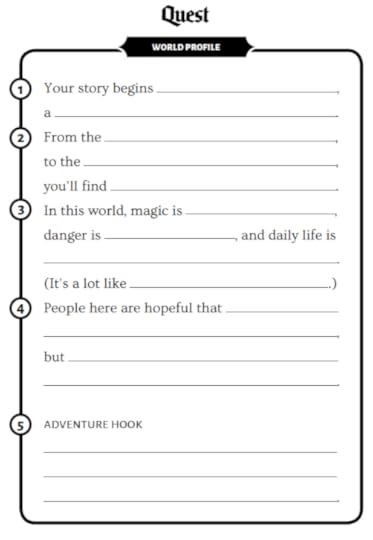 I mean, this is just lovely(Another quick tip – download the free World Profile worksheet for the Quest RPG. It’s a wonderfully short and simple document that prompts just the right amount of setting detail, and it works for any game.)