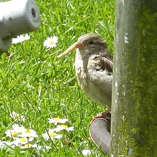 And then we have the oddest little female sparrow. We thought she had a bit of nesting material stuck to her beak, but no. It’s not the greatest photo because she’s a fast mover. The top half of her beak is wildly overgrown and we’ve named her Stickybeak.  She eats by twisting her head to the side and appears to be doing okay. She’s been here for dinner for several days now, and likes standing on the hose.