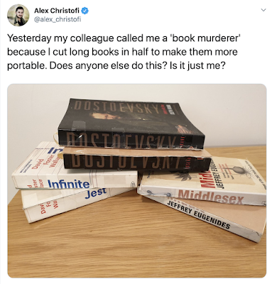 Tearing books in half is on a whole other level, but I can relate with that too. Especially as an adult, I have limited time for reading, and it can be daunting to see a thick wad of pages past my bookmark. If dividing it into two parts can make it easier to get through, then fine, be a book murderer. Lately, I just gravitate toward shorter books, but maybe next time a long book seems worth it, I'll consider introducing it to my scissors.