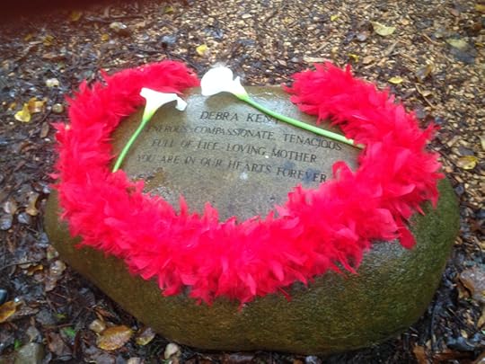 Many a gathering around the boulder in the Grove, emblazed with her name and the words “Generous, Compassionate Tenacious, Full of Life Mother, You are in our hearts forever” were marked by tears and laughter in the late afternoon, as the sun set and the damp coolness of the Grove descended around us. For a few moments, she was with us in our memories, in our stories, amazed that we were still there, amazed that we continue to honor her. The leaves on the trees, yellow and brown would fall silently as our witnesses to the cycle of life and death, of love and loss, of dark and light. What started in the last rays of the day, ended in the darkness of the evening, which shrouded the trees and rocks and path that were so clear when we arrived.  A chill would settle in, and despite our down coats and hats, our noses would get cold and we would all begin to rock back and forth to keep ourselves warm. Our time with our memories would pass, yet the surroundings held us. Even in the dark, our hearts beat stronger, warmed by the love of life within the existence of suffering and death..