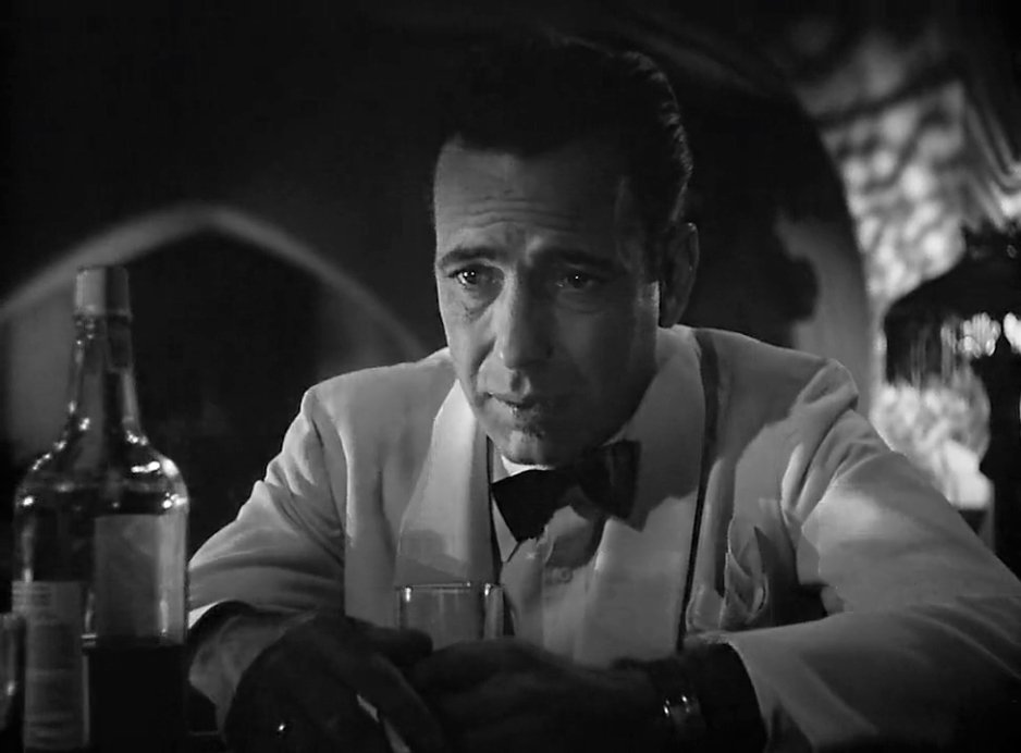 In Casablanca, another one turned down by George Raft, Rick does play the sap, but only till he wises up and joins the war effort. This movie was made to explain to Americans why they were fighting in Europe. Rick is America—an isolationist, “I stick my neck out for nobody,” and in all things, even in love, a businessman (“A frank for your thoughts.” “In America they’d bring only a penny.”), but when he sells his bar and Signor Ferrari wants Sam thrown in he says, “I don’t buy or sell human beings”—the issue that brought about, to use Griffith’s phrase, the birth of a nation.He's a wonderfully tough guy: “Can you imagine us in London?” “When you get there, ask me.” “How about New York?” “Well there are certain sections of New York, Major, that I wouldn't advise you to try to invade.” Can you hear the cheers?