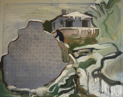 Strangely for a depiction of Greece, this is a winter landscape – in fact there is occasionally snow even in this southern part of the country. Things grow fast on the island, and arriving at the cottage always requires a day or two of work to reclaim it from the plants and creatures that move in as soon as human beings move out. In the painting, the surrounding nature is indistinct and seems to be in motion, oozing forward, growing over the property, which is also shown in semi-ruined form, deteriorating back into the landscape, or (re-)emerging from it.