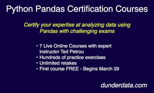I am excited to announce Python Pandas Certification Courses — a series of courses to help you become an expert at using the pandas library to analyze data, each with a challenging certification exam given at the end.