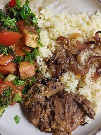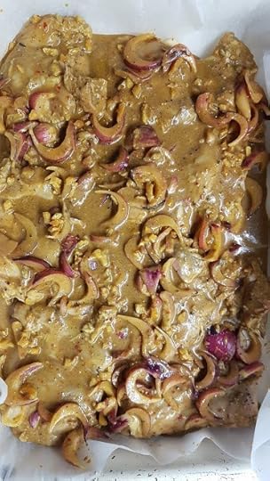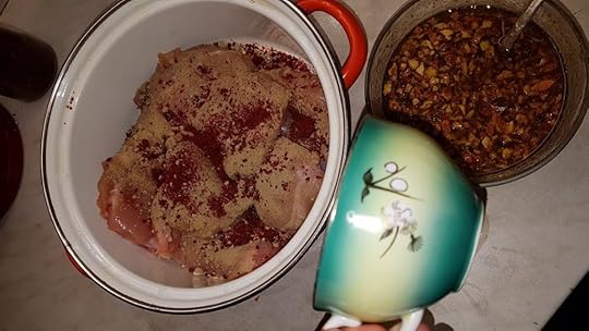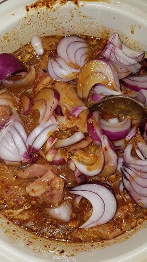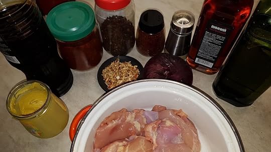 курячі стегна без шкіри чи філебагато синьої цибулі (2 шматки м’яса-1 невелика цибулина). Це найдорожча частина рецепту, але ріпчаста цибуля не те пальтосоєвий соус (пів чашки_винний чи яблучний оцет (неміцний тобто, до 5%) (майже пів чашки)ложка медуложка гірчиціложка оліїмелений чорний перець, мелена папрікашкірки мандарина чи апельсинамелене сушене манго (гуглиться як амчур). Можна і без нього, але манго+апельсини то самий цимес в цій страві.