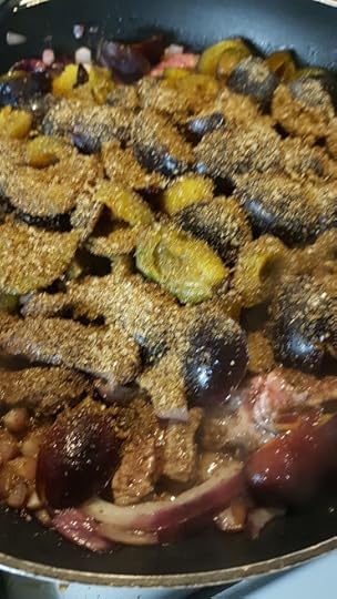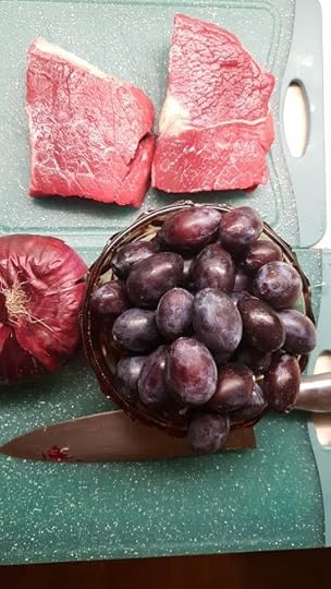 м’ясо 600 грамів (в мене яловичина, але мабуть інші типи м’яса будуть ок, особливо птиця)велика пласка фіолетова цибуля (я фанатка такої цибулі. Дорога, зараза, зате солодка. Можете брати ріпчасту, в цьому разі це не принципово)Сливи майже кілограм. Я не знаю, скільки використала, бо багато з’їла, поки чистила. Зо більше слив, бо рідкіший соус.Трохи олії, чебрець, сіль, будь-яка зелень, можна сванську сіль чи хмелі-сунелі.МузикаЩо робимо: