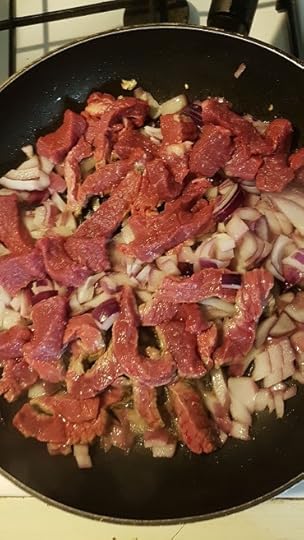 цибулю порізати напівкільцями, чвертями, дрібно — на що вас вистачить.Поставити грітися пательнюМ’ясо порізати поперек волокон тонкими скибкамиНалити олію, насипати в неї чебрець (це щоб менше все псувалося від нагрівання, там антиоксиданти в чебреці), висипати цибулюhttps://photos.app.goo.gl/YnzXt7qyqh2pn1Y18Додати м’ясо
