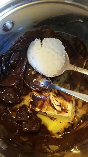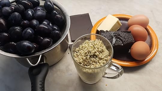 Деко застелити паперомвикласти сливи без кісточкиприсипати цукромпоставити в духовку на 180 градусівВ каструлі з товстим дном розтопити шоколад і масло. кипіти не треба.збити блендером яйця, горіхи чи що ви взяли замість них, та маквсе змішати разомрозмолоти прянощі (буде пахнути Рідзвом)додати все, + ванільний цукор, бо воно геть не солодке.