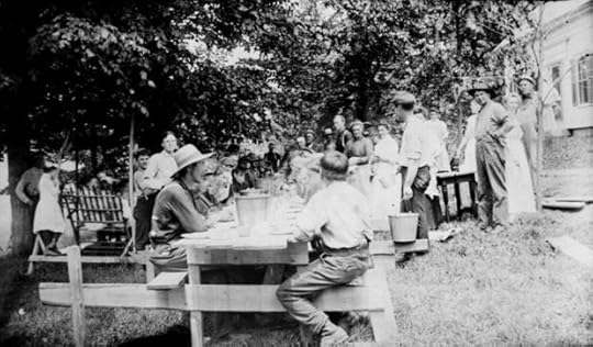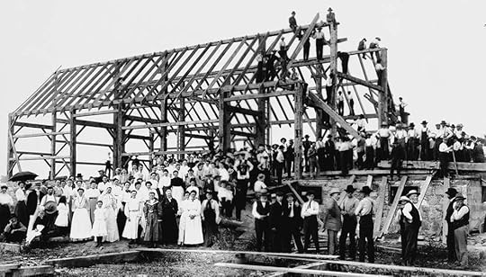 One of the best scenes shows the community coming together for a barn raising. From miles away sturdy young men, their straw hats flapping in the breeze, stride to the barn’s intended site. In the corner of the yard, women folk fuss over the heavily laden wooden tables. The tables groan with delicious homemade bread, cake, ham and side dishes − more than plenty to fill up the hardworking friends who showed up. The scene paints a magnificent ode to neighborliness. From the ground the men pull together like a finely oiled machine, each lifting, pulling and sawing as the structure takes form in front of us. Raise a bar in a day? Impossible, we English might say. But as the sun goes down, the lucky farmer views the completed structure, ready to house his livestock.