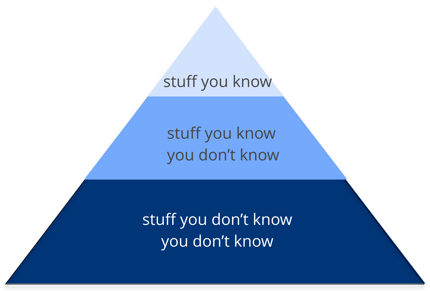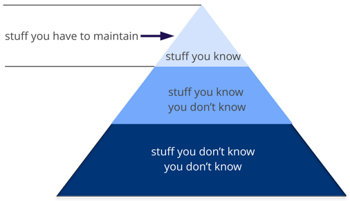 Atualmente estou lendo o livro “Fundamentals of Software Architecture” — Mark Richards, Neal Ford — recomendo bastante. Na parte introdutória, os autores mostram uma pirâmide chamada, Knowledge Pyramid (pirâmide do conhecimento) que ilustra muito bem os conceitos de Amplitude (o quanto eu sei) X Profundidade (o que eu sei). Este artigo de Neal Ford traz mais detalhes sobre esta temática. Em resumo, as duas imagens a seguir trazem uma pirâmide onde no topo encontram-se as coisas que sabemos e que precisam ser mantidas, no meio as coisas que sabemos que existem mas não temos conhecimento sobre elas e por fim na base, está o que de fato desconhecemos.