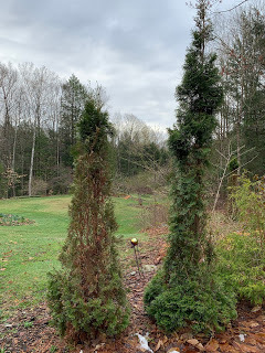 My arborvitae survived the winter, but they have interesting shapes--a full head of hair on top and a flouncy skirt at the bottom. In between, one is see-through. The other has an hour-glass figure.