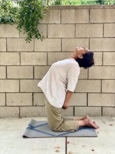 4. Now slowly breathe in as you straighten up and continue to bend back opening up the chest fully as you keep filling your lungs and extending open your diaphragm. Once again hold the breath in and gently squeeze the body. The arms are now back at hip level.