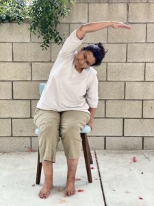 3. Now place your right hand on the floor by your side or on the chair and extend the left arm over the head raising the left shoulder and bending towards the right breathing in as you go into the posture. Hold the posture and the breath. Breath out as you bring your left arm back and lower your left shoulder. This is for the middle portion of the left lung.