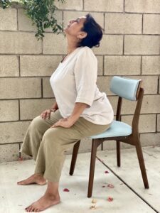 2. Maintain the seating posture. Place your left hand on the floor by your side or on the chair and extend the right arm over the head raising the right shoulder and bending towards the left breathing in as you go into the posture. Hold the posture and the breath. Breath out as you bring your right arm back and lower your right shoulder. This is for the middle portion of the right lung.
