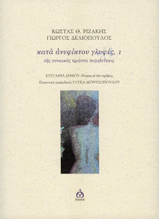 Πάντοτε με συγκινούν οι προσφορές βιβλίων με την ιδιόχειρη αφιέρωση του δημιουργού. Πόσο μάλλον όταν μ' αυτούς με συνδέει μια σχέση αλληλοεκτίμησης, πρώτα απ' όλα, φιλίας και συνοδοιπορίας. Χθες παρέλαβα απ'το Γιώργο Δελιόπουλο την νέα ποιητική του συλλογή, από κοινού με τον ποιητή Κώστα Θ. Ριζάκη, "κατά ανεφίκτου γλυφές, 1- της γυναικός τριάντα παγιδεύσεις", εκδόσεις ΑΩ, με την άκρως αναλυτική και διαφωτιστική εισαγωγή της Ευσταθίας Δήμου για την ποίηση των δύο και την εξαιρετική, ως συνήθως, εικαστική παρέμβαση της Γλύκας Διονυσοπούλου.